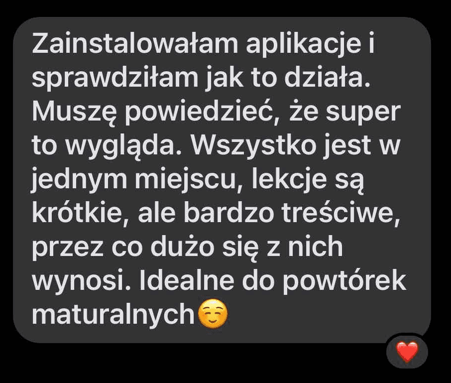 Ta aplikacja jest niesamowita i używam jej żeby uczyć się do matury z matmy. Jestem bardzo zadowolona z postępów.